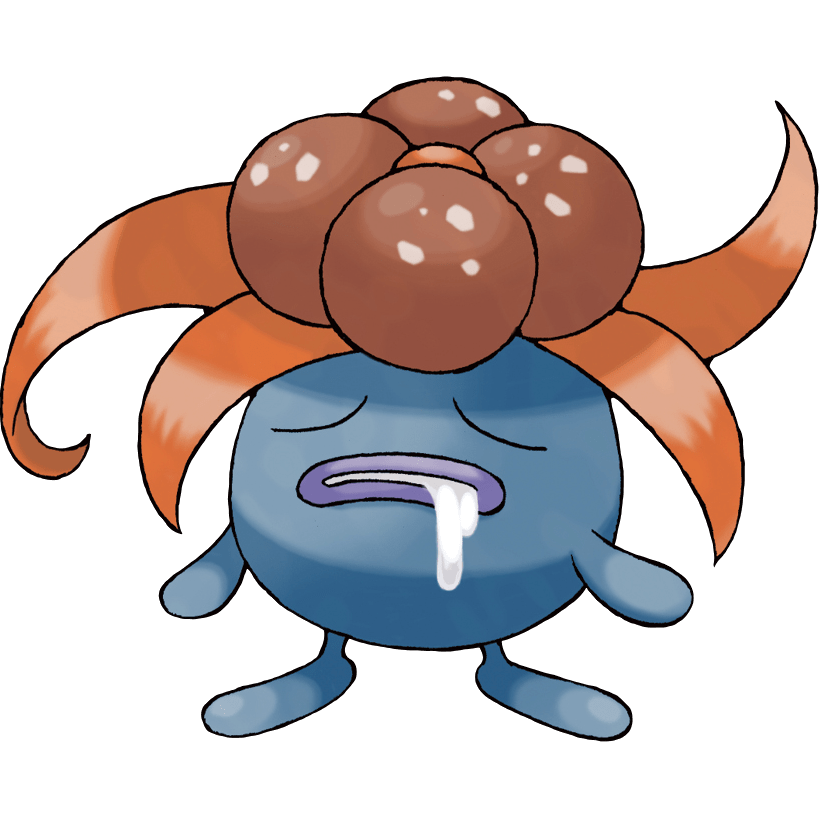 As part of our first branching evolution family covered here, Gloom also has the option of evolving into Bellossom instead. Bellossom also has the unique, if underwhelming, distinction of being the only Pokemon that loses a type upon evolving without gaining a new one in return. Ultimately for all of this I have to ask quite simply: why??? Unfortunately, Bellossom is an extremely boring design and the distinction of it losing a typing is largely to its detriment. It completely throws away everything interesting and lovable about its pre-evolutions and Vileplume, it gets way smaller for no reason, and takes on a bizarre out of nowhere hula aesthetic that feels really tacked on, and all of this comes together to make it feel like it shouldn’t even be a part of this family. The vague idea of a poisonous plant expelling its toxins upon evolution and becoming friendlier is an interesting one, but the execution falls flat completely, as nothing about Gloom as a design is actually preserved here at all when it just turns into a fundamentally different Pokemon. In a sad twist of irony, it’s also just categorically worse than Vileplume too: despite being positioned as a more defensive counterpart, losing the Poison typing is absolutely damning for its defensive utility and leaves it as a completely hopeless pure Grass Pokemon with nothing to do and a design that has nothing to say. It would be a mediocre Pokemon by itself, but as a counterpart to Vileplume and an iteration on Gloom it’s flat out bad. Overall, a resounding disappointment.