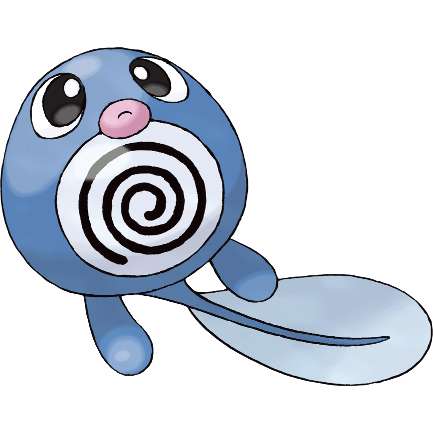 Poliwag starts off simple but strong, with a blobby body and distinct tail that make it clearly a tadpole while having a good amount of stylisation to it. Poliwag introduces the central concept of the line: taking inspiration from tadpoles whose swirling intestines can be partially seen through their semi-translucent skin to have a distinct spiral pattern, which is given a distinct monochromatic view here to evoke classical depictions of hypnotism. Despite the slew of Psychic and quasi-psychic Water types in Generation 1 this gives this line an already interesting niche that stands out and proceeds to define the evolution line. Already Poliwag is showing that it has a distinct “mascot” stylisation to it rather than trying for more complex or bizarre fantastical elements with less broad appeal. It’s a nice start to something that’s obviously going to become a frog in all instances, right?