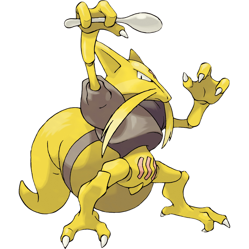 Kadabra, in a move that is both ideal and disappointing, drops a lot of Abra’s charm as an ineffectual, skittish baby and leans more into the creepy elements of its design. It abandons any pretense of being cute or cowardly and now projects the image of a focused, fierce telekinetic brimming with psychic power. Kadabra leans quite heavily into a loose spattering of occult imagery: its spoon-bending technique, star marking, and bizarre abdominal zigzags pair well with its gangly form that uses its large head and tail as an effective contrast to look skinnier. Kadabra is definitely the member of this evolution line trying the least to look flattering, which did also make it arguably the worst one to be named after a real person (though all three members of the family do this). The recently dropped lawsuit by Uri Geller has definitely plagued Kadabra’s ability to appear in spinoff media, most notably the TCG that it was absent from for nearly two decades, but fortunately this seems to have resolved amicably in recent years. Away from the sensationalist idea of psychic powers in real life though, Kadabra is more than a legitimate force in the world of Pokemon, and while it’s a far cry from my favourites I think this creepy mammalian creature does a very good job of making the Psychic type just plain weird and scary, with its own flavour of cool a lot of Pokemon don’t go for.